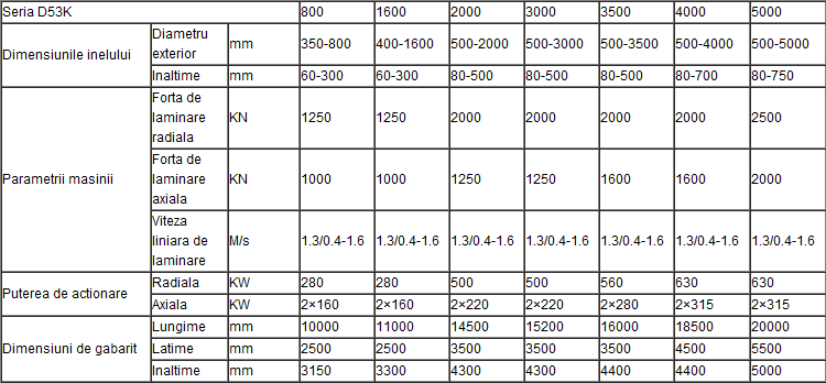 Seria D53K a masinii de laminat radial-axial inele adopta tehnologia CNC pentru laminarea radiala si axiala a pieselor inelare. Este necesar doar sa fie introduse dimensiunile inelului, ale semifabricatului inelar, comanda si specificatia materialului si apoi laminarea se face in mod automat. Dimensiunile inelului si starea masinii vor fi afisate pe un monitor cu tub catodic.